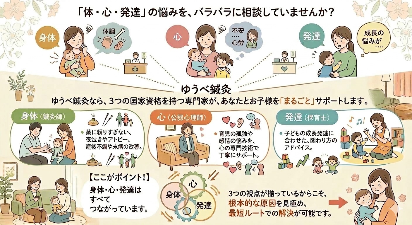 お子さんの夜泣き、かんしゃく、アトピーで悩んでいる、食べてくれない、よく泣く、便秘がち、すぐ体調を崩す、登園を渋る、子どもが学校へ行けなくなった、子育てが不安…